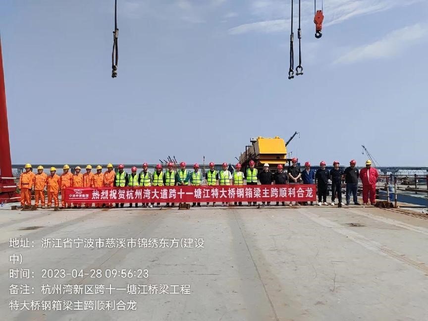 2023年4月28日上午,由浙江工程建設管理有限公司監理的寧波前灣新區的杭州灣大道跨十一塘江特大橋主跨順利合龍,為全線如期建成通車奠定了堅實的基礎。